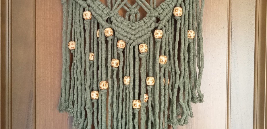 Per questo arazzo, delle dimensioni di 50 x 70 cm, ho utilizzato 40 mt di una corda di cotone a filo unico di spessore di 5 mm, caratterizzata da una morbidezza che rende ogni nodo piacevole da eseguire e da toccare. La lavorazione è stata realizzata con nodi piatti e nodi barretta, tecniche estremamente semplici che esaltano la bellezza naturale del legno e della corda. Ogni perlina di legno inserita in questo arazzo rappresenta per me una piccola cosa che può cambiare lo sguardo, un dettaglio apparentemente banale che, se osservato con attenzione, può trasformare la nostra percezione del mondo.