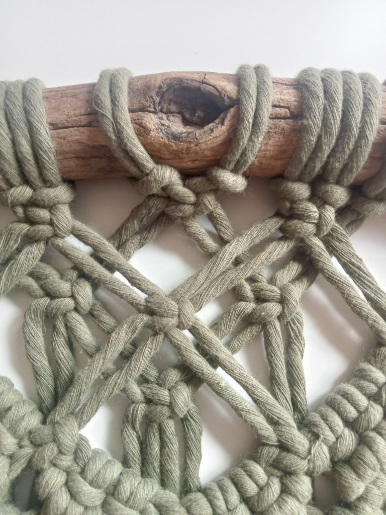 Il legno che viene utilizzato per creare un arazzo ha un ruolo spesso sottovalutato o preso in considerazione solo come sostegno dei fili. Io credo che tutto sulla terra abbia una vibrazione energetica, anche i legni che trovo a terra. Tutto questo, per come io vivo il macramé, è molto importante. Ci sono legni che ricordano visi di animali, altri che richiamano code o pinne di pesce, altri ancora che hanno venature circolari che ricordano un occhio. A volte un progetto parte proprio da un legno, altre volte impiego più giorni per trovare il legno giusto per uno specifico lavoro. (Tratto “Il viaggio di un Arazzo in Macramé” )