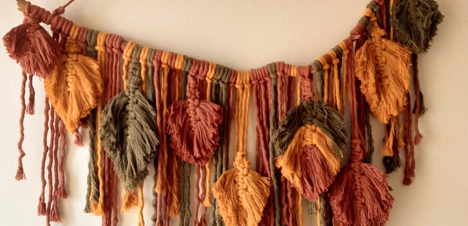 Le foglie in macramé sono spesso protagoniste nei corsi per principianti. Semplici da realizzare e visivamente piacevoli, rappresentano un ottimo punto di partenza per esplorare l’arte di annodare. Tuttavia, ammetto che non mi hanno mai davvero conquistato, è una questione di gusti. La loro bellezza si scontra spesso con la necessità di un trattamento rigido: per rimanere in forma hanno bisogno di essere trattate con colla vinilica o spray fissanti altrimenti tendono a “lasciarsi andare”, accartocciandosi e assumendo un aspetto spettinato e imperfetto. Proprio quell’imperfezione, per molti poco estetica, è stata invece la chiave per la creazione del mio arazzo dedicato all’autunno.